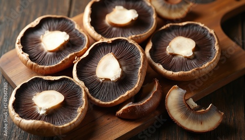Several sliced portobello mushrooms rest on a wooden cutting board. Their dark gills contrast with light stems. These raw fungi are natural ingredients for healthy meals.