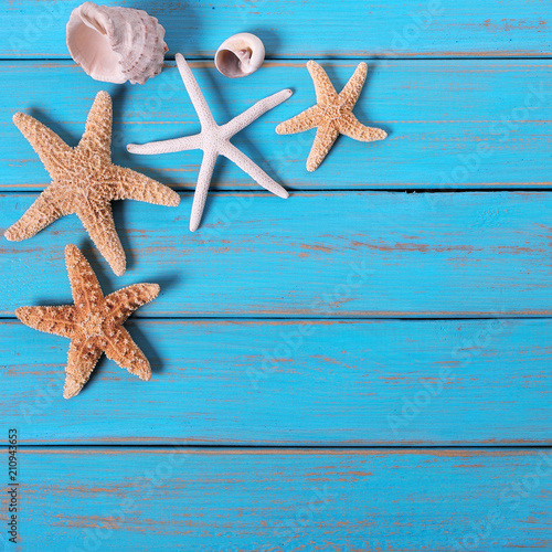 Several starfish old weathered blue beach wood deck background