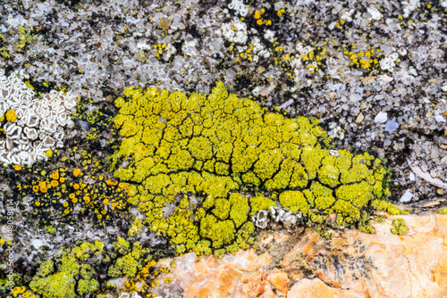 Several types of crustose lichen on concrete hydraulic structures on the beach of the Black Sea, Ukraine.