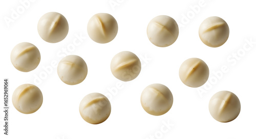 Several whole, shelled macadamia nuts levitating in a clean, scattered pattern. The nuts are creamy white and perfectly round. Photorealistic with soft lighting on a transparent background.