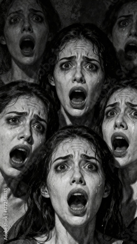 Several women with wet hair display extreme fear and sadness in a dimly lit environment. Their expressions convey shock and despair, capturing a powerful moment of emotional turmoil