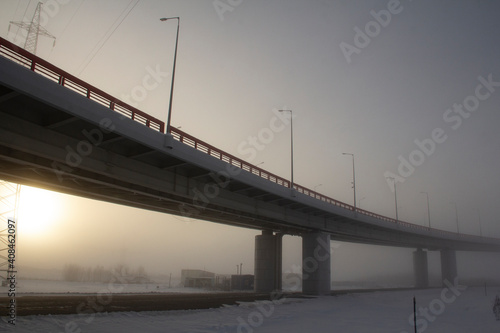 Severe frost and heavy fog on the road. Abnormal frosts in the city, fog is on the streets. Bridge 'Red Dragon' in Khanty-Mansiysk
