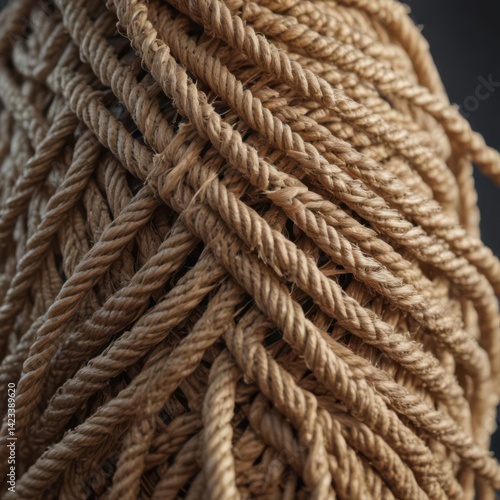 Severed rope fibers, extreme close-up showing frayed ends under tension, image, broken