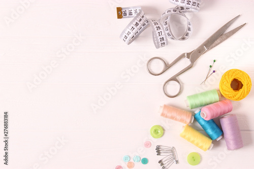 sewing accessories on white background top view.