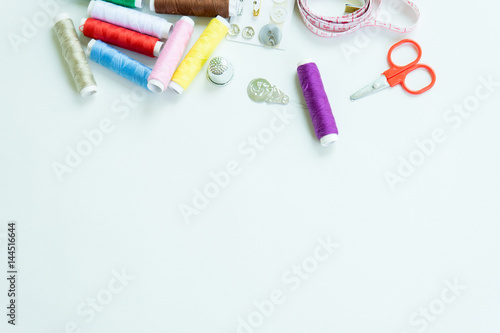 Sewing accessories, tools ,colorful spools, needle and measuring tapeof thread with scissors isolated on white background, top view
