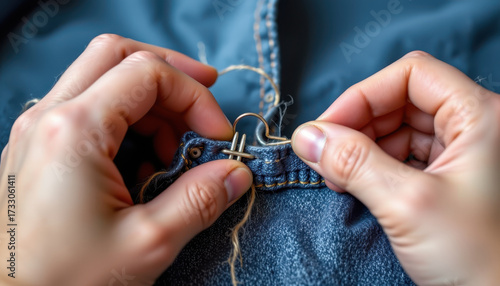 Sewing hands close up, mending denim fabric with needle and thread, showcasing craftsmanship and attention to detail. image captures essence of textile repair and creativity