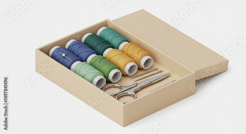 Sewing kit with colored threads and tools in beige box, isolated on white background