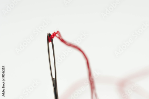 Sewing needle with red thread, close up macro shot isolated on white background.
