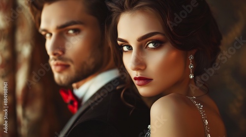 Sexy and elegant couple. Handsome man hugging his sensual wife