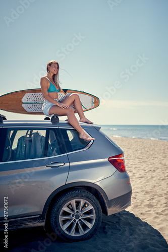 Sexy girl waiting for the high waves on beach - Sporty people with surf boards on the beach - Extreme sport and vacation concept.