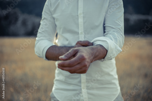 Sexy man buttons cuff-link on french cuffs sleeves luxury white shirt. Outdoor image. Summer background.