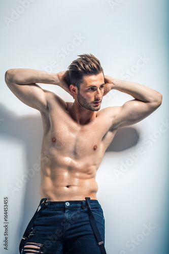 Sexy muscular shirtless man posing against white wall