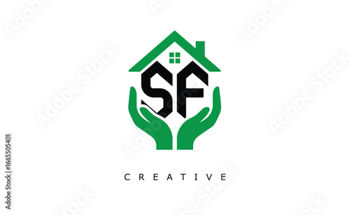SF Home Care Logo - Green House and Hand Symbol for Real Estate, Eco Housing & Modern Branding