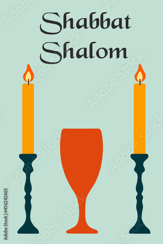 Shabbat Shalom - Jewish and Hebrew greetings. Vector cartoon illustration of a cup with candles. Judaism concept.