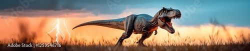 Shadow of a T-rex roaring as lightning strikes in the distance