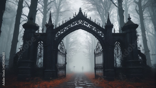 Shadows of the Past: Old Gothic Gate Looming in the Misty Depths of the Forest, Commemorating World Goth Day, Generative AI