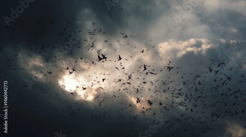 Shadowy birds swarm under storm clouds, feathers faintly glowing. A haunting omen of unseen forces gathering.