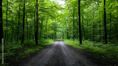 Shady Forest Path Leading Through Dense Green Trees With Sunlight Filtering Down