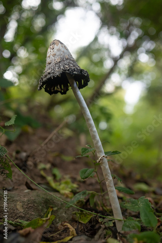 Shaggy Mane, shaggy ink cap or lawyer's wig. Vertical photo of an old mushroom
