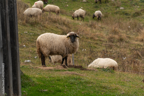 Shaggy sheep graze on a green hillside