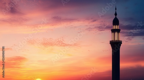 Shahada glowing on a mosque minaret at dawn, illuminated devotion, 3D illustration