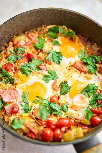 Shakshouka for breakfast. Homemade shakshuka, fried eggs, onion, bell pepper, tomatoes and parsley in a pan. Marble background. Top view. chakchouka