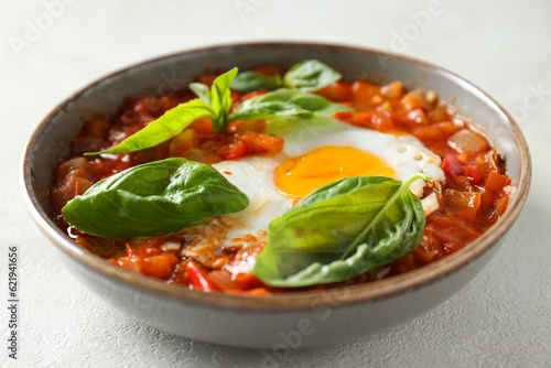Shakshuka with basil in bowl on light background, close up