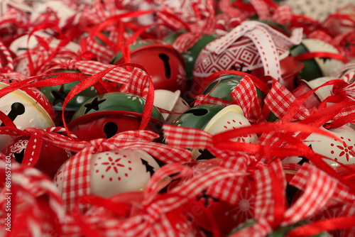 Shallow depth of field image of crotal bells or sleigh bells with focus on the bottom left third, The green and red bell. Magical Christmas image.