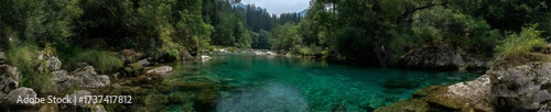 Shallow turquoise river scene nature hdr panoramic view lush forest 360-degree landscape