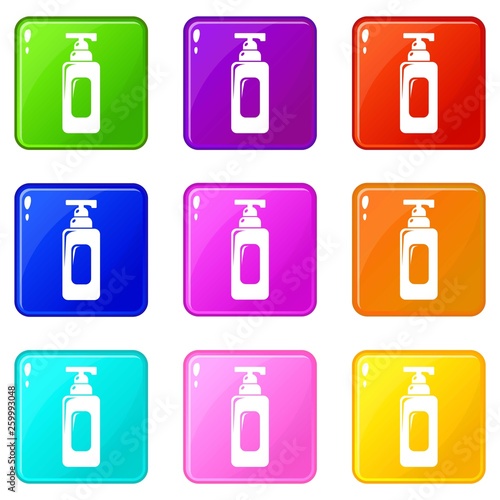 Shampoo dispenser icons set 9 color collection isolated on white for any design