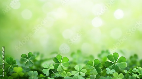 Shamrocks on a bokeh lit green background, a symbol of luck and St. Patrick's Day