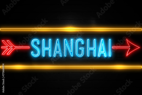 Shanghai - fluorescent Neon Sign on brickwall Front view