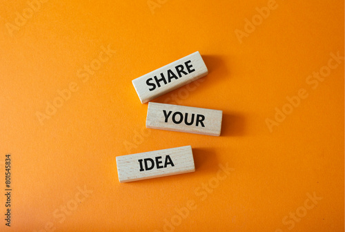 Share your Idea symbol. Concept words Share your Idea on wooden blocks. Beautiful orange background. Business and Share your Idea concept. Copy space.