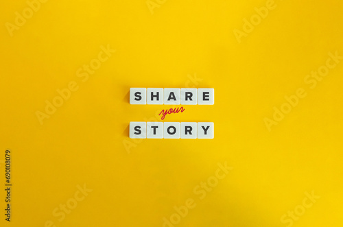 Share Your Story Banner and Concept Image. Block Letter Tiles and Cursive Text on Yellow Background. Minimalist Aesthetics.