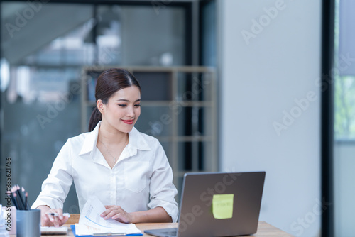 Sharing good business news. Attractive young businesswoman talking on the mobile phone and smiling while sitting at her working place in office and looking at laptop PC.