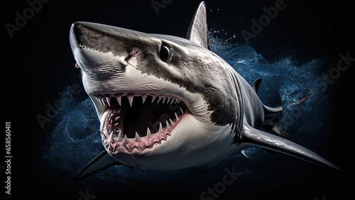 Shark on black background, in the style of contemporary realism portrait.