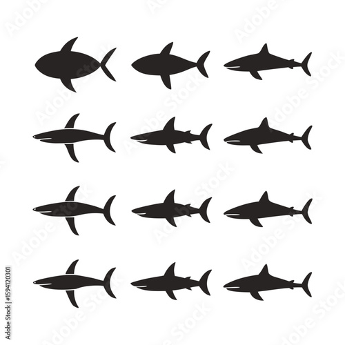 Shark Silhouette Vector Bundle – 12 Dynamic Swimming and Hunting Poses in Solid Black