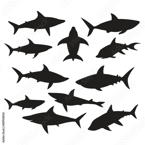 Shark silhouette vector illustration, various species of sharks, great white, hammerhead, bull shark, tiger shark, ocean predators, sea life, marine biology, underwater, fish, dangerous, carnivore