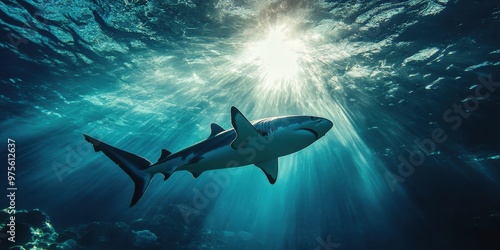 shark swimming in the deep sea geographic photography style