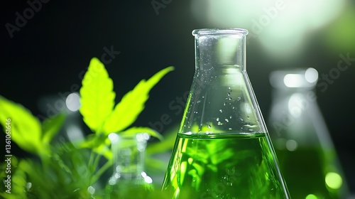 Sharp and vibrant green liquid in a glass flask, symbolizing innovation in scientific research and environmental sustainability. 32k Resolution