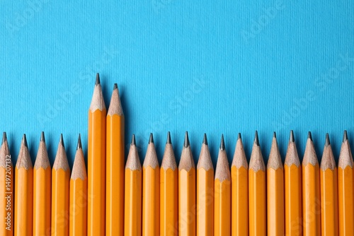 Sharp graphite pencils on light blue background, flat lay. Space for text
