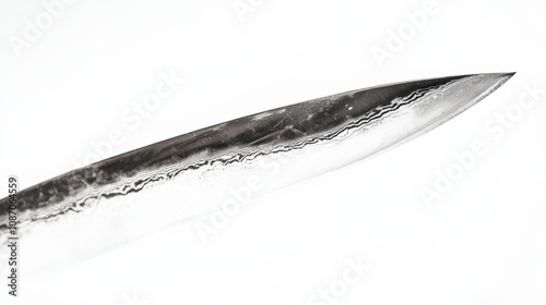 Sharp knife blade precision craftsmanship steel metal tool utensil blade edge cutting weapon forged textured surface detail close up single isolated white background object grey