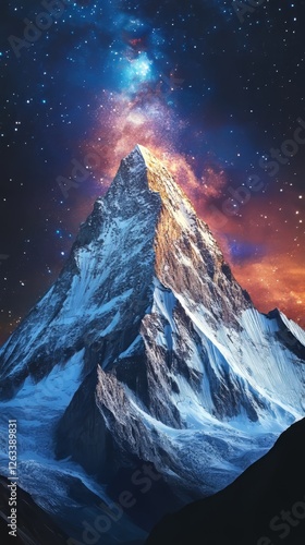 Sharp mountain peak illuminated by golden twilight with a vibrant Milky Way galaxy stretching across the night sky
