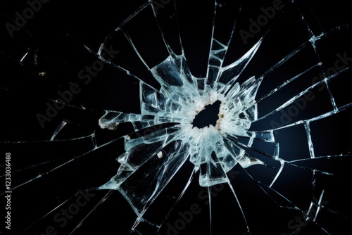 Shattered Glasses: Broken Glass with Bullet Hole and Cracks Over Black Background