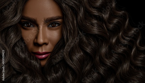 She has long, curly dark brown hair styled in a braid, gentle, expressive eyes;