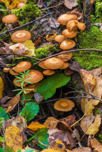 Sheathed woodtuft mushrooms on a dead tree covered with moss