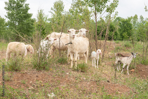 Sheep and goat cubs in a meadow in the mountains.