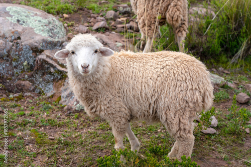 Sheep grazing on Taquile Island, Lake Titicaca, Peru