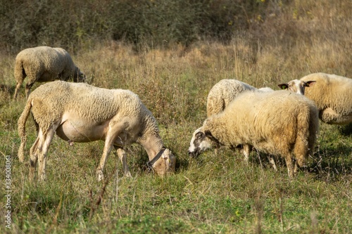 Sheep on the meadow eating grass in the herd during colorful sunrise or sunset. Slovakia