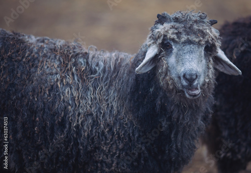 Sheep Portrait. A flock of domestic sheep walks on a muddy pasture. Muzzle sheep. Breeding animals. Isolated shot of a cute domestic sheep with lots of wool.